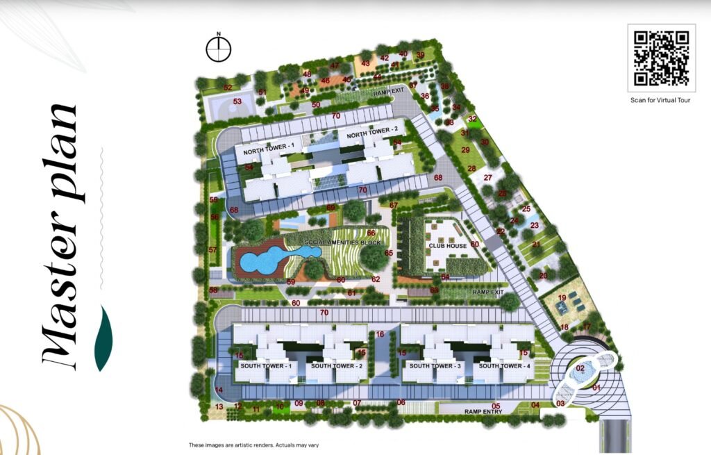 A grand 55,000 sq.ft clubhouse anchors the lifestyle here, featuring indoor badminton and squash courts, billiards, table tennis, co-working spaces, guest rooms, a supermarket, restaurant, gym, spa, meditation zones, banquet hall, pools, and more, complemented by an extensive outdoor environment with water bodies, sculpture gardens, picnic lawns, hammock zones, jogging trails, cricket nets, golf putting, children’s play areas, and dedicated wellness zones.